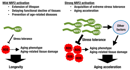 The KEAP1-NRF2 activity and longevity. Although ROS induce aging-related phenotypes, oxidative stress is not the only factor that regulates lifespan. In experimental models, mild activation of NRF2 extends lifespan by modulating ROS levels and attenuating aging-related phenotypes. Strong NRF2 activation, rather than conferring extreme stress tolerance, accelerates the aging process.