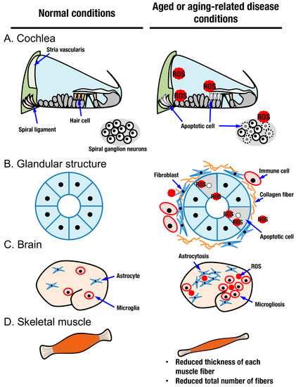 Aged oraging-related disease conditions in several organs. Normal conditions and aged or aging-related disease conditions in the cochlea (A), glandular structures (B), brain (C), and skeletal muscle (D). In the cochlea, aging-related oxidative stress irreversibly impairs hair cells, spiral ganglion neurons, the spiral ligament, and the stria vascularis (A). In glandular structures such as the lacrimal gland and salivary gland, elevated oxidative stress, collagen deposition, immune cell infiltration, and apoptosis are observed (B). In aging-related neurodegenerative diseases such as AD and PD, abnormal accumulation of oxidative stress and abnormal distribution of cells termed microgliosis and astrocytosis are observed (C). Aged skeletal muscle exhibits reduced thickness and decreased numbers of muscle fibers (D).