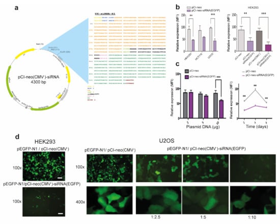 Functional validation of pCI-neo(CMV−)-siRNA knock-down efficacy in epithelial cells. (a) Scheme of the pCI-neo(CMV−)-siRNA expression vector. The upper right side shows a detail of the cloned convergent expression cassette holding the U6 and H1 polymerase III promoters in opposite orientation substituting the CMV promoter. (b) Functional characterization of the convergent expression system for siRNA production. Left: co-transfection of pEGFP-N1 and pCI-neo or pCI-neo-siRNA(EGFP) (1:5) in HEK293, HCT116 and U2OS cells. Right: co-transfection of pEGFP-N1 and pCI-neo, pCIneo-siRNA(EGFP), pCI-neo(CMV-), or pCI-neo(CMV-)-siRNA(EGFP) (all at 1:5 ratio) in HEK293 cells. (c) Dose-response assay. Left: transfection of different amounts of pCI-neo(CMV-) or pCIneo(CMV-)-siRNA(EGFP) (2–10 μg) within clone 293FT-EGFP. Right: co-transfection of pEGFP-N1 and pCI-neo(CMV-) or pCI-neo(CMV-)-siRNA(EGFP) in 293FT-EGFP cells analyzed at various times post-transfection. In all cases the median fluorescence intensity (MFI) was analyzed by flow cytometry. Data are expressed as means ± SD. n = 3 with 4–6 technical replicates/each. **p < 0.01; ***p < 0.001 compared to the control. (d) Representative fluorescence microscopy images showing the efficiency of the siRNA convergent expression system in HEK293 and U2OS cells. At 48 h after co-transfecting pEGFP-N1 and pCI-neo(CMV-) or pCI-neo(CMV-)-siRNA(EGFP) at the indicated ratios and magnifications.