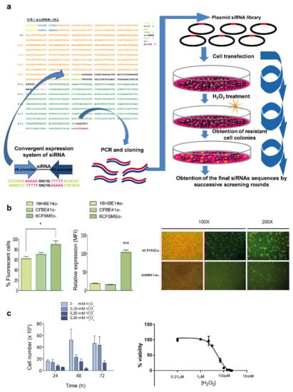 Outline of randomized siRNA library cloning, epithelial cell introduction, and selection of oxidative stress-resistant colonies. (a) Schematic representation of the cloning and transfection steps used to obtain the 181 final siRNA sequences. First, a construction containing a randomized siRNA library within a convergent expression cassette was cloned into the pCI-neo vector. The convergent expression system was optimized to express the siRNAs using two opposite promoters. Furthermore, the siRNA library within the convergent expression system was transfected and expressed in CF submucosal gland cells. These cells were subjected to H2O2-mediated stress and different resistant colonies arose. Successive screening rounds were performed until a final collection of 181 siRNA sequences capable to confer oxidative stress resistance were obtained. (b) Optimization of transfection in human airway epithelial cells. Transfection efficiency of human airway epithelial cells. Left: 1 × 106 cells were transfected with 3 μg of pEGFP-N1 and the percentage of fluorescent cells and median fluorescence intensity (MFI) were analyzed by flow cytometry. Data are expressed as means ± SD. n = 3 with 5 technical replicates/each. * p < 0.05; *** p < 0.001 compared to the control. 16HBE14o-, bronchial epithelial cells; CFBE41o-, bronchial epithelial cells homozygous for the CFTR F508del mutation; 6CFMEo-, compound heterozygous submucosal gland epithelial cells for the CFTR F508del, and Q2X mutations. Right: representative phase contrast and fluorescence microscopy images comparing the transfection efficiencies from 6CFSMEo- and 16HBE14o- cells. (c) Assessment of oxidative stress sensitivity in 6CFSMEo- airway epithelial cells. 6CFSMEo- viable cell number trough toxicity assays after exposure to H2O2. n = 4. Left: optimization of the necessary dose of H2O2 to obtain 90%–100% cell death in 6CFSMEo- cells. At 24 h after seeding 1 × 106 cells per plate, the medium was changed to fresh medium containing different H2O2 concentrations. Cells were counted at 24, 48, and 72 h. Right: Toxicity curve of H2O2 in 6CFSMEo- cells. The concentration range used in the study was 0–500 μM.