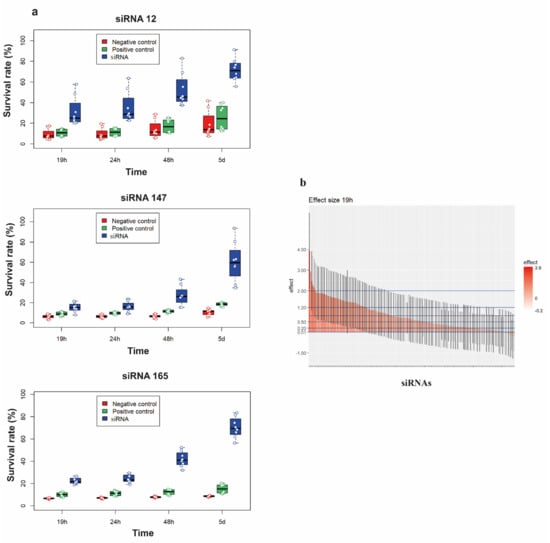 To validate the individual activity of the 181 siRNA sequences, we re-screened the corresponding siRNA-containing plasmids through a high-throughput and fast functional assay in 96-well plates using reverse transfection of 6CFSMEo- cells, short-term exposition to a lethal H2O2 concentration, and viability monitorization at different times after high intensity oxidative stress induction. Most unique siRNA-bearing plasmids from the initial screen were able to increase the survival rate of 6CFSMEo- cells challenged with 0.3 mM H2O2 compared with pEGFP-N1-transfected 6CFSMEo- control cells (Figure 3a). Statistical validation of the assay outcome indicated a moderate variability of the different siRNA clones conferring increased cell survival upon H2O2 challenge. When the siRNA clones were represented as effect size, where a major effect size represents a higher resistance to oxidative stress, the results obtained were robust and reproducible throughout all times analyzed (Figure 3b). Ultimately, 167 distinctive siRNAs (92%), able to confer significant oxidative stress resistance in airway epithelial cells, were selected for further analysis (Table S2).