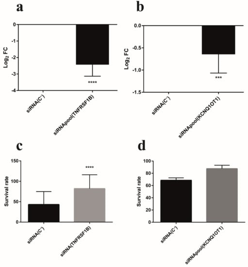 Further supporting the participation of the above siRNA target gene catalog in the oxidative stress process entailed the demonstration of RNAi-mediated oxidative stress protection from airway epithelial cell damage through carefully designed siRNAs targeting sequences, unrelated to those unveiled from the randomized siRNA library, against defined siRNA target transcripts. Two selected transcripts were chosen for that purpose: KCNQ1OT1 and TNFRSF1B. The lncRNA KCNQ1OT1 is positioned in the KCNQ1 locus. Up to six different siRNA sequences, from the total of 167, matched within the KCNQ1OT1 gene with a high percentage of homology (68–78%), indicating that this lncRNA might hold an important role in oxidative stress. Regarding TNFRSF1B, the corresponding siRNA clone presented a high percentage of matching homology (73%) with this transcript and induced significant resistance to oxidative stress (large effect size > 0.8). Moreover, TNFRSF1B may function as a death cell receptor [], and the TNF-TNFR pathway is an important hub regulated by ROS in inflammation []. Thus, we set up to assess whether optimized pools of four different siRNAs could induce the silencing of KCNQ1OT1 and TNFRSF1B transcripts in 6CFSMEo- cells and, concomitantly, could generate the oxidative stress resistance phenotype previously obtained from the randomized siRNA library clones targeting KCNQ1OT1 and TNFRSF1B, respectively. In both cases 6CFSMEo- transfection of the respective siRNA pools, but not of a control non-targeting siRNA pool, was able to significantly downregulate these transcripts (Figure 4a,b). Moreover, these same siRNA pools induced oxidative stress resistance and increased the viability of 6CFSMEo- cells (Figure 4c,d). Analogous results were obtained using the non-CF airway epithelial cell line 16HBE14o- cells (data not shown).
