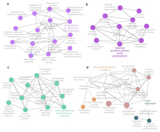 Main clusters of overrepresented biological pathways and terms from KEGG and Reactome knowledgebases. A total of 56 groups were identified with ClueGO Cytoscape plug-in from 152 enriched terms. Four out of the 56 groups are visualized. These correspond to clusters with 10 or more components. For each group, the most significant term is highlighted. (a) Regulation of dendrite development. (b) Internal protein amino acid acetylation. (c) Sphingomyelin biosynthetic process. (d) Microtubule-based transport, axon cytoplasm and vesicle cytoskeletal trafficking. Circle size is inversely proportional to obtained adjusted p-value.