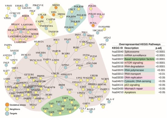 Protein-protein Interaction network built with siRNA target genes and 1st shell interactors from STRING database. Very high confidence 1st shell (direct) interactions were selected (minimum score of 900). Neighbors are highlighted in yellow. siRNA target genes are colored in blue. Genes related to oxidative stress are colored in orange. Main network submodules are marked with different background colors, according to the associated significantly enriched KEGG pathway obtained from the over-representation analysis (ORA) over the complete protein-protein interaction (PPI) network. Corresponding KEGG pathway identifiers (ID) and description are shown on the right. They are sorted by adjusted p-values retrieved from ORA.