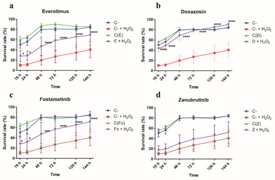 On the other hand, the performance of selected candidate drugs conferring oxidative stress resistance obtained by data mining was also assessed. Thus, 5 × 103 6CFSMEo- cells per well were added in a 96-well plate to a final volume of 100 μL/well. After 24 h, the selected drugs: everolimus, doxazosin (both from Tocris Bioscience, Bristol, UK), fostamatinib (Invivogen, San Diego, CA, USA), and zanubrutinib (MedchemExpress, Monmouth Junction, NJ, USA) were incubated at the indicated concentrations for 24 h according to preliminary optimization assays. Consequently, the cells were exposed to 100 μL/well of 0.9 mM H2O2 plus fresh drugs. As a negative control, cells without drug treatment exposed to 0.9 mM H2O2 were used. Conversely, as a positive control, cells treated with the above drugs but without H2O2 exposure confirmed its lack of toxicity at the concentrations tested.