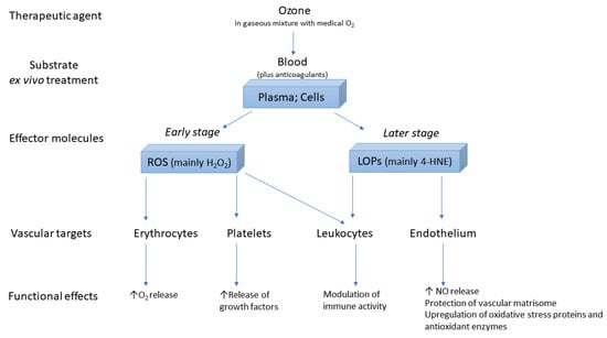 A schematic representation of the key reactions of the gaseous mixture oxygen/ozone on the blood during ex vivo treatment, with the production of the effector molecules responsible for the functional effects on the intravascular compartment during M-AHT, is shown in Figure 2.