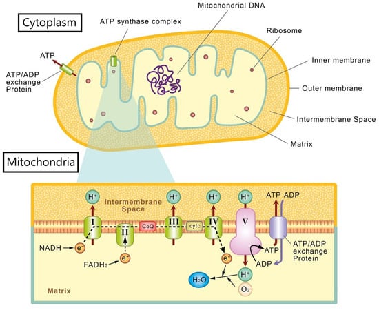 The mitochondria consists of two membranes (i.e., outer and inner membranes), forming an intermembrane space between the membranes, and a separate matrix found within the inner membrane []. The most important function of the mitochondria is its role in energy production to maintain cellular function []. ATP, the major energy source of cells, is generated from the electron transport chain, a process that takes place in the inner membrane of mitochondria through oxidative phosphorylation (OXPHOS) []. In the electron transport chain, there are five protein complexes (I, II, III, IV, and V). From complex I to complex IV, electrons are shuttled from reduced nicotinamide adenine dinucleotide (NADH) or flavin adenine dinucleotide through ubiquinone (coenzyme Q[CoQ]) and cytochrome c, to the final product, hydrogen dioxide. The complexes also generate a proton gradient between intermembrane space and matrix, for the final step in ATP production. Complex V, also termed ATP synthase, uses the proton gradient to phosphorylate adenosine diphosphate (ADP) and produce ATP []. Then, the generated ATP is transported to the cytoplasm to supply the cellular need via the ATP/ADP exchange proteins in the inner and outer membranes (Figure 1) []. Mitochondria also take part in other cellular functions such as metabolism of ROS, balancing intracellular calcium levels, biosynthesis of cell structural components, and signaling for apoptosis (i.e., programmed cell death) []. The major signal for apoptosis is cytochrome c, located in the mitochondrial intermembrane space, which can be induced by cellular stress or injuries []. Furthermore, mitochondria are highly dynamic organelles in response to different functional states and toxic conditions [,]. The major dynamic characteristics of mitochondria are fusion and fission [], which are important for mitochondria to change its morphology and maintain its functional properties [].