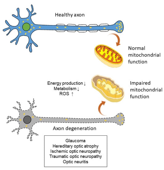 Impaired mitochondrial function can lead to axon degeneration and subsequent eye diseases.