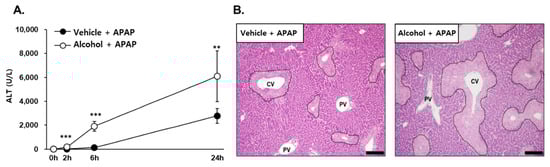 Male C57BL/6 mice (7-weeks-old, n = 50) were purchased from Hyochang (Daegu, Korea). The mice were cared for according to the guidelines established and authorized by the Institutional Animal Care and Use Committee of Pusan National University (approval no. PNU-2021-2916). The mice were housed in a specific animal facility at standard room temperature (22 ± 2 °C), humidity (55 ± 5%) and a 12 h light and dark cycle. For one week of acclimatization to the experiment, the mice were orally administered three consecutive doses of alcohol (ethanol, 5 g/kg) or distilled water as vehicle at 12 h intervals []. APAP (300 mg/kg) was orally administered to mice 12 h after the last alcohol administration, designated as APAP 0 h []. The mice were sacrificed at 0, 2, 6, and 24 h after APAP treatment (Figure S1).