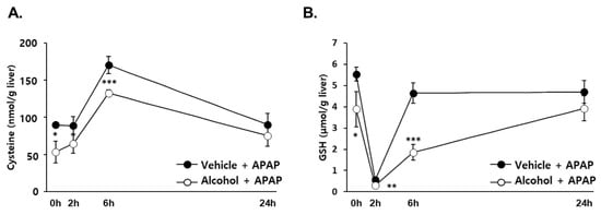 GSH, a tripeptide composed of cysteine, glycine, and glutamate, plays a pivotal role in the removal of NAPQI from the oxidation of APAP. Both non-enzymatic and GST-mediated reactions are involved in the conjugation reaction, and in the presence of high concentrations of GSH and NAPQI, rapid non-enzymatic detoxification is dominant [,]. Because the concentration of glutamate and glycine is much higher than that of cysteine in the liver, the changes in cysteine levels are a critical determinant in the synthesis of GSH []. To investigate changes in cysteine availability to synthesize GSH after APAP treatment, we analyzed the hepatic concentration over 24 h. GSH depletion rapidly occurred and recovered in the liver of APAP-treated mice, whereas pre-treatment with binge alcohol prolonged APAP-induced GSH depletion and persisted at lower levels throughout the experimental period (Figure 2). Cysteine concentrations increased up to 6 h after APAP treatment, which may explain the enhanced utilization of this amino acid to replenish rapidly depleted GSH through biosynthesis (Figure 2). Moreover, lower levels of cysteine in alcohol binges compared with APAP alone, probably due to a decrease in its supply through the trans-sulfuration pathway. These results suggest that alcohol binges reduce the regenerating potential of GSH after consumption, followed by an enhancement of APAP toxicity in the liver.