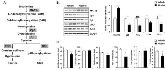 To further determine the effect of alcohol binges on the metabolic pathway for synthesis of liver GSH, changes of sulfur amino acids as well as corresponding enzymes (Figure 3A) were measured in vehicle- and alcohol-treated mice. Hepatic MAT1α protein levels were markedly increased, but CβS, CγL, and GCLC protein levels were significantly reduced by binge alcohol administration. CDO, mediating taurine synthesis, was not changed (Figure 3B). Hepatic methionine concentration was decreased and there was no significant alteration in SAM levels by alcohol intake (Figure 3C). Binge alcohol administration resulted in decreased SAH, cysteine, and GSH in the liver. The level of taurine was not changed. Cysteine is irreversibly metabolized in the liver to yield either taurine or GSH [,]. A decrease in liver GSH by alcohol binges appears to be associated, at least in part, with depression of GCLC, the rate-limiting enzyme for GSH synthesis, as well as cysteine availability for generation of taurine.