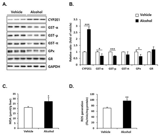 Reduced GSH levels implicate disruption of liver redox homeostasis. For identification of additional changes in the redox environment, we measured the protein expression of CYP2E1, which generates ROS during metabolism of alcohol, as well as GSH-related antioxidant enzymes. Alcohol administration increased hepatic CYP2E1 protein to 250% of vehicle at 12 h after the final dosing (Figure 4A). The protein levels of GSH-dependent antioxidant enzymes including GST-α, -μ, GPx in the liver of alcohol-treated mice were significantly lower than those of vehicle (Figure 4B). Binge alcohol did not induce a significant change in GST-π and GR (Figure 4B). Subsequent measurement of oxidative stress indicators such as MDA, a lipid peroxidation end product of polyunsaturated fatty acids (PUFAs), (Figure 4C) and ROS (Figure 4D) levels showed that alcohol binges induced significant oxidative stress in the liver.