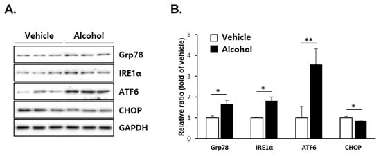 ER stress has been proposed as an important mechanism for the progression of alcoholic liver injury [,,,]. In particular, dysregulation of sulfur amino acid metabolism due to chronic alcohol intake is known as one of the risk factors for inducing ER stress [,,]. In line with this, we sought to determine whether alcohol binges induce an ER stress response. Higher levels of Grp78, IRE1α, and ATF6 were observed in the alcohol-treated group compared with those of the vehicle-treated group, while the CHOP protein level was downregulated to 80% of the vehicle-treated group at 12 h after the final alcohol administration (Figure 5).