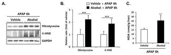 To investigate the effect of alcohol binges on APAP-induced oxidative stress, hepatic levels of MDA, nitrotyrosine-protein adducts, and 4-HNE, another lipid peroxidation product from PUFAs, were measured at 6 h after APAP administration with/without pre-treatment of alcohol binges. As shown in Figure 6A,B, alcohol + APAP significantly induced the levels of nitrotyrosine-protein adducts and 4-HNE compared with vehicle + APAP. Differences in liver MDA levels (Figure 6C) were consistent with changes in nitrotyrosine-protein adducts and 4-HNE levels, indicating that hepatic oxidative stress increased by alcohol binges was exacerbated by subsequent administration of APAP.