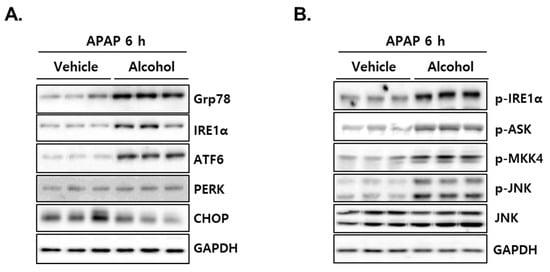 According to accumulated reports, CHOP activation via ER stress response is one of the important mechanisms in APAP-induced acute liver injury [,,]. Therefore, we explored the ER stress-mediated cell death signaling pathway to elucidate the mechanism by which liver injury was amplified in the alcohol + APAP group. As shown in Figure 7A, alcohol + APAP showed significant induction of a crucial ER chaperone, Grp78, as well as ER-localized stress sensors such as IRE1α, ATF6. Another ER-localized stress sensor, PERK, did not change, and, unexpectedly, the expression of CHOP was decreased in the liver of alcohol + APAP mice (Figure 7A). In further investigation of ER stress-mediated cell signaling, alcohol + APAP showed significantly induced IRE1α-ASK-MKK4-JNK activity (Figure 7B). These results suggest that APAP administration after alcohol intake can amplify liver injury through a signaling pathway that is different from CHOP activation by APAP alone.