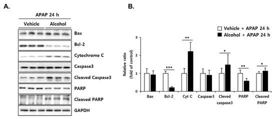 Protein expression of the apoptotic signaling cascade was examined at 24 h post-APAP administration (Figure 8). Although Bax was not changed, the alcohol + APAP exhibited significantly higher expression of pro-apoptotic proteins (cytochrome C, cleaved caspase3, cleaved PARP) and a lower level of anti-apoptotic protein (Bcl-2) than vehicle + APAP. These results suggest that APAP administration in mice pre-exposed to alcohol binges enhances the apoptosis signal compared to the APAP alone group, which could eventually lead to amplification of liver injury.