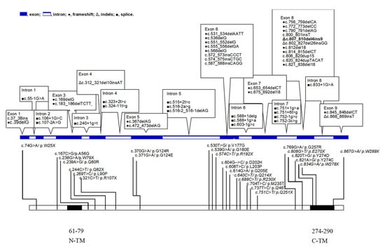 Based on the missense and nonsense mutations, the ratio of nonsense to missense mutations was 15: 11 (Figure 1). It is thus postulated [41,51] that nonsense mutations contribute to more severely nonfunctional proteins that cause a more severe phenotype. Among SURF1 mutations, the majority were splice-site, frameshift, and nonsense mutations (Figure 1). Most SURF1 mutations occur in exons 6, 7, and 8, which account for approximately half of the total mutations. Strangely enough, the length of exons 6 to 8 accounts for only a small proportion of the total SURF1 gene. The longest exon, exon 5, contains 192 base pairs but harbors a small number of different mutations (Figure 1).