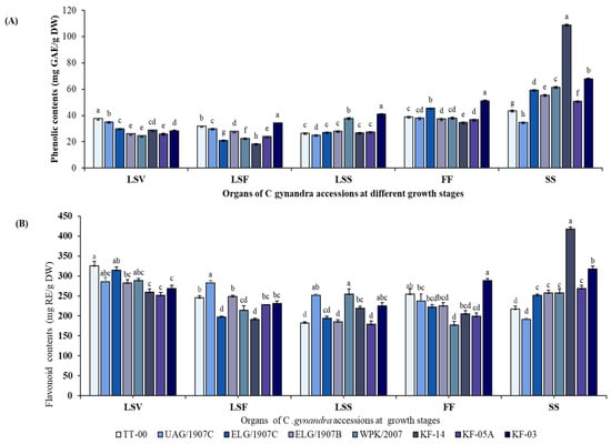 Changes in total phenolic content in mg GAE/g DW (A) and total flavonoid content mg RE/g DW (B) in the different organs of eight CG accessions during growth. Column and error bars represent the means and standard deviation (n = 3). Columns with different letters for each specific organ are significantly different (p < 0.05). mg GAE/g DW = milligram gallic acid equivalent per gram of dry weight; mg RE/g DW = milligram rutin equivalent per gram of dry weight; LSV = leaves and stem in the vegetative stage; LSF = leaves and stem in the flowering stage; LSS = leaves and stem in the seed set stage; FF = flower in the flowering stage; SS = silique in seed set stage.