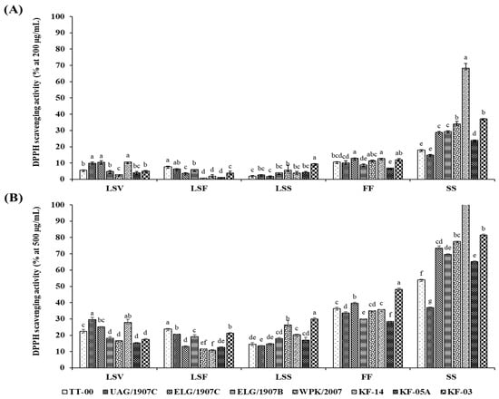 Dose-dependent (A,B) DPPH+ radical scavenging activity of extracts from 8 accessions of CG organs collected at various stages. Columns with the different letters for each organ are significantly different (p < 0.05). LSV = leaves and stem in the vegetative stage; LSF = leaves and stem in the flowering stage; LSS = leaves and stem in the seed set stage; FF = flower part in the flowering stage; SS = silique part in the seed set stage.