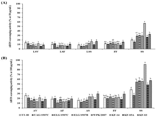 The in vitro AOA was determined using the stable DPPH free radical scavenging activity and the radical cation ABTS scavenging capacity assays. Scavenging activities were ranked in the following descending order: SS > FF > LSS > LSV > LSF. Generally, the growth stage and organ type had a significant influence on the AOA, which also differed significantly among the accessions studied (Figure 2 and Figure 3). Moreover, although the pattern of change in AOA was consistent for both the DPPH and ABTS assays, the absolute values of the assays differed, with ABTS yielding higher scavenging activities for extracts at lower concentrations than DPPH assay. In particular, the highest and lowest percentage inhibitions exhibited by ABTS assay at extract concentration of 50 µg/mL were 57.22 ± 0.69% and 4.08 ± 1.09%, respectively, while DPPH exhibited the highest of 68.26 ± 2.96% and lowest of 0.71 ± 0.05% inhibition for sample concentration of 200 µg/mL.