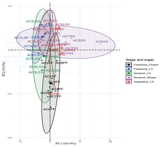 Principal component analysis (PCA) biplot of scores and loadings of the total phenolic, total flavonoid, and rutin content and antioxidant activities of extracts from organs at different growth stages of the eight accessions of CG. AC = accession, TFC = total flavonoid content, TPC = total phenolic content, ABTS = azinobis (3-ehtylbenzothiazoline-6-sulfonic acid), DPPH = 2,2 diphenyl-1-picrylhydrazyl, FF = flower, LSF = leaves and stem at flowering stage, LSS = leaves and stem at seed set stage, LSV = leaves and stem at vegetative stage, SS = siliques at seed set stage. AC1 = TT-00, AC2 = UAG/1907C, AC3 = ELG/1907C, AC4 = ELG/1907B, AC5 = WPK/2007, AC6 = KF-14, AC7 = KF-05A, AC8 = KF-03.