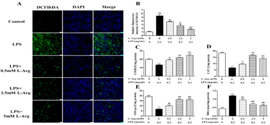 To determine whether l-Arg could exert a protective effect against LPS-induced oxidative stress, the ROS level was detected by fluorescence staining. As present in Figure 2A,B, l-Arg addition significantly inhibited the increased ROS production induced by LPS treatment in myotube cells. Furthermore, the activities of T-AOC, T-SOD, CAT, GSH-px, and the content of MDA were measured. As expectedly, l-Arg significantly increased T-AOC, T-SOD, CAT, and GSH-px activities in LPS-induced myotube cells (Figure 2C–E). In addition, l-Arg blocked the LPS-induced increase in MDA content in cells (Figure 2F).