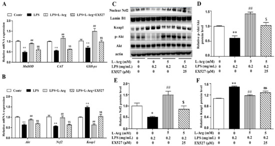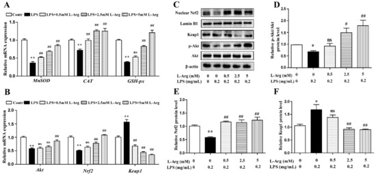 To further confirm the mechanism by which l-Arg acted against LPS-induced oxidative stress, the expression of antioxidant-related genes and proteins were measured using RT-PCR and Western blot analysis. As shown in Figure 3A,B, l-Arg treatment significantly inhibited the Keap1 mRNA level and increased the mRNA levels of MnSOD, CAT, GSH-px, Nrf2, and Akt. Western blot analysis revealed that LPS incubation reduced the protein ratio of p-Akt/Akt (Figure 3C,D) and the nuclear protein level of Nrf2 (Figure 3C,E), which were significantly reversed by 2.5 and 5 mM l-Arg treatment. The protein expression of Keap1 showed an opposite trend to that of Nrf2 (Figure 3C,F).