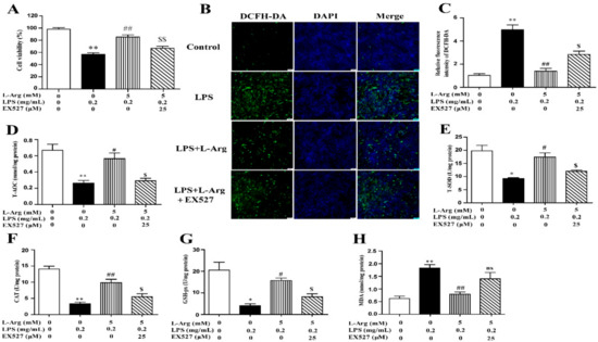 l-Arg ameliorated LPS-induced oxidative stress through SIRT1. The myotube cells were pretreated with 25 μM EX527 for 24 h, then 5 mM l-Arg was added to cell culture for 1 h prior to LPS (0.2 mg/mL) stimulation for an additional 24 h. (A) Cell viability was detected using a CCK-8 assay. (B) Cells were stained with DCFH-DA. The fluorescence intensity was tested using fluorescent microscopy (Scale bar = 50 μm). (C) Quantitative analysis of relative fluorescence intensity of DCFH-DA. (D–H) The MDA content and the activities of T-SOD, CAT, and GSH-px in myotube cells. Data are presented as the mean ± SEM of at least three independent experiments, * p < 0.05, ** p < 0.01 versus the Control group; # p < 0.05, ## p < 0.01 versus the LPS group; $ p < 0.05, $$ p < 0.01 versus the LPS + l-Arg group; ns, no significantly.