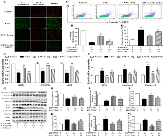 In order to determine whether SIRT1 is involved in l-Arg alleviating LPS-induced apoptosis via the FOXO3a-mediated mitochondrial apoptosis signaling pathway in myotube cells, the expression levels of SIRT1, FOXO3a, BAX, Bcl-2, Caspase-9, and Caspase-3 were detected by RT-PCR (Figure 8E,F) and Western blot (Figure 8G–M). l-Arg increased the SIRT1, FOXO3a, and Bcl-2 mRNA levels, which were significantly inhibited by the EX527. In contrast, the mRNA levels of BAX, Caspase-9, and Caspase-3 were opposite to that of Bcl-2. In addition, SIRT1 inhibitors significantly abolished the inhibition of l-Arg on LPS-induced SIRT1 and p-FOXO3a/FOXO3a protein level decrease. At the same time, EX527 significantly eliminated the l-Arg-induced decrease in BAX protein levels. However, co-incubation with l-Arg, LPS, and EX527 significantly eliminated the down-regulation effects of Cleaved Caspase-9/Caspase-9 and Cleaved Caspase-3/Caspase-3 protein levels by l-Arg.