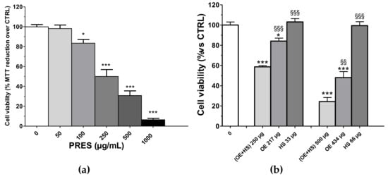 (a) Effects of PRES (0–1000 µg/mL, 24 h) on SH-SY5Y cell viability. Controls (CTRL; PRES 0 µg/mL) represent untreated cells. (b) SH-SY5Y cells’ viability after treatment with 250 µg/mL or 500 µg/mL of a 13:2 (w/w) mix of the extracts prepared from Olea europea L. leaves (OE) and Hybiscus sabdariffa L. calyces (HS), respectively, or to the corresponding amount found in 250 µg/mL or 500 µg/mL of only the Olea europea L. leaves extract (OE, 217 and 433 µg/mL, respectively) or Hybiscus sabdariffa L. calyces (HS, 33 and 67 µg/mL, respectively). Data were reported as mean ± SEMs. * p < 0.05, *** p < 0.001 vs. CTRL; §§ p < 0.01, §§§ p < 0.001 vs. (OE + HS) same bar group (ANOVA followed by Bonferroni post hoc test).