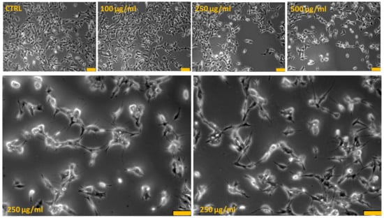 PRES-induced human neuroblastoma SH-SY5Y cells morphological changes: contrast-phase microscopy analysis. Bottom photos represent an enlarged view of 250 µg/mL PRES treated cells in which it is evident cells shrinkage and membrane bleb formations typically occurring in apoptotic-mediated cells death. Each photograph was representative of three independent observations (yellow line: scale bar 75 µm).
