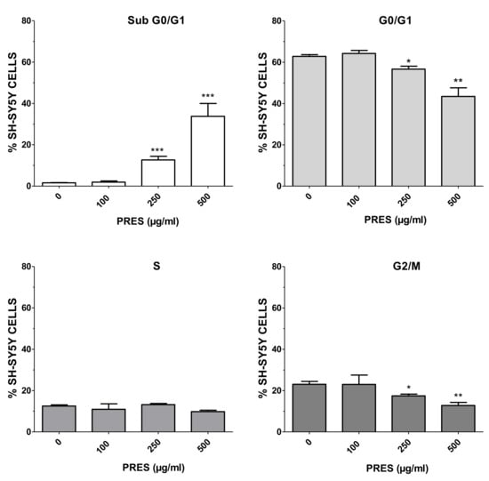Percentage of SH-SY5Y cells at different phases of the cell cycle following treatment for 24 h with 100, 250 or 500 µg/mL PRES. Controls (CTRL, PRES 0 µg/mL) represent untreated cells. Data are reported as mean ± SEMs. * p < 0.05, ** p < 0.01, *** p < 0.001 vs. CTRL (ANOVA followed by Dunnet’s post hoc test).