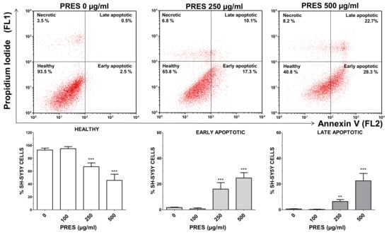 Apoptotic cells’ detection by double staining with annexin V (AV) and propidium iodide (PI). Top: representative dot plot of SH-SY5Y cells treated with 0, 250 or 500 µg/mL pf PRES, showing progressive increase in early- and late-apoptotic cells. Bottom: quantitative analysis. After the treatment with PRES (0, 100, 250 and 500 µg/mL for 24 h), SH-SY5Y cells were stained with AV and PI and flow cytometric analysis performed. Healthy cells were those negative for both AV and PI. Cells in early apoptosis were those stained by annexin V but not by PI, while those in late apoptosis were stained by both dyes. The excitation of the fluorochromes was performed at 488 nm, while the emitted green (AV) and red (PI) fluorescences were, respectively, detected at the wavelength of 530 ± 30 nm (FL1) and 585 ± 42 nm (FL2). Values are means ± SEMs; controls (CTRL, PRES 0 µg/mL) represent untreated cells. ** p < 0.01, *** p < 0.001 vs. CTRL (ANOVA followed by Dunnet’s post hoc test).