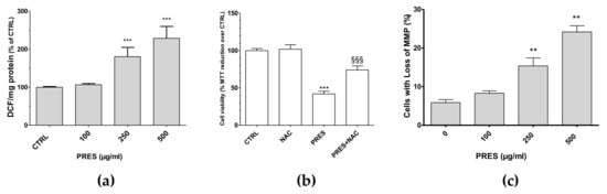 (a) PRES-mediated effects on intracellular ROS formation; (b) cell viability in the presence of N-acetyl-L-cysteine (NAC); (c) and cells with loss in MMP. Data are reported as means ± SEMs; controls (CTRL, PRES 0 µg/mL) represent untreated cells. ** p < 0.01, *** p < 0.001 vs. CTRL; §§§ p < 0.01 vs. PRES (ANOVA followed by Bonferroni post hoc test).