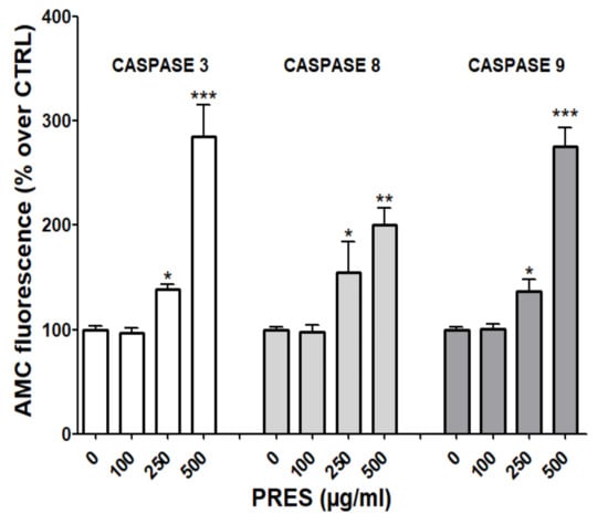 Mitochondria- and the extrinsic receptor-mediated pathways of apoptosis are both involved in the induction of cell death upon the activation of caspase-9 and 8, respectively. These, in turn, activate caspase-3 and fragmentation of DNA [21]. To further investigate which pathway(s) is (are) involved in the observed effects, fluorescence assays with specific caspase-3, 8 and 9 substrates were performed. As reported in Figure 6, the activities of all cleaved caspase-3, -8 and -9 were significantly increased, especially at the highest PRES concentration, suggesting the activation of both the mitochondrial- and extrinsic receptor-mediated apoptosis pathways.