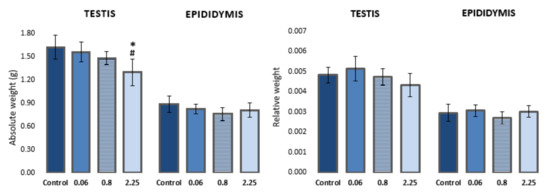 Absolute and relative weights of the left testis and epididymis of Wistar rats (N = 5 rats per group) treated orally for 28 consecutive days with imidacloprid at doses of 0.06 mg/kg b. w./day, 0.8 mg/kg b. w./day, and 2.25 mg/kg b. w./day and the respective negative control. Results are presented as means ± standard deviation. Statistical significance was set at p < 0.05. *—vs. negative control, #—vs. dose 0.06 mg/kg b. w./day.