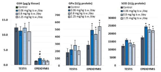 Antioxidant status was evaluated in the testis and epididymis of experimental animals by measuring levels of GSH and activities of antioxidant enzymes, GPx and SOD (Figure 2, Table S1). In general, the testes contained higher levels of GSH than the epididymis, while the activity of both antioxidant enzymes was higher in the epididymis than in the testes.