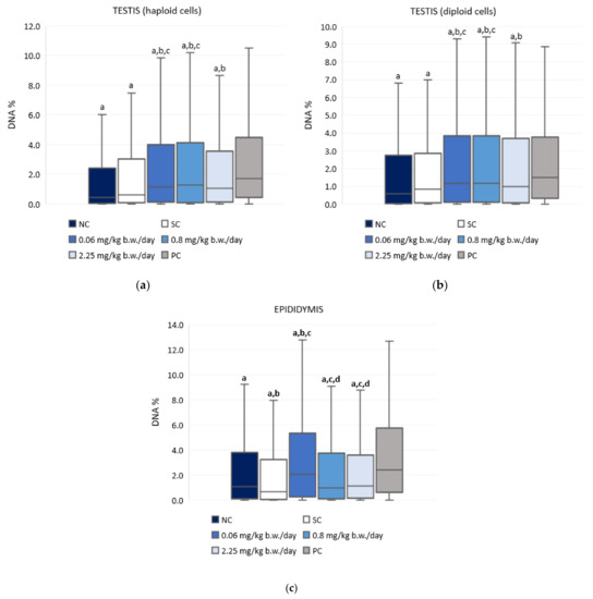 Results of the alkaline comet assay expressed as tail intensity (DNA%) in (a) testicular haploid, (b) testicular diploid, and (c) epididymal sperm cells of Wistar rats (N = 5 rats per group) treated orally for 28 consecutive days with imidacloprid at doses of 0.06 mg/kg b. w./day, 0.8 mg/kg b. w./day, and 2.25 mg/kg b. w./day and in the respective controls (NC—negative control, SC—solvent control, PC—positive control). Data are presented as median (line), 25th and 75th percentile (box), and range (whisker). Statistical significance was set at p < 0.05 (a—vs. positive control, b—vs. negative control, c—vs. solvent control, and d—vs. dose 0.06 mg/kg b. w./day).