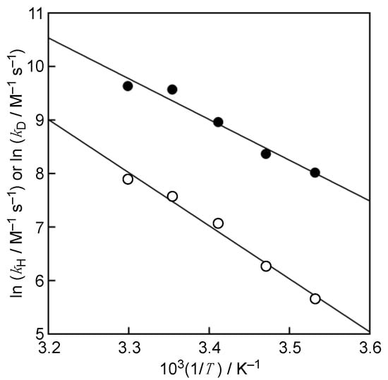 Furthermore, as seen in the Arrhenius plots based on the Arrhenius equation Equation (3) (Ea(H), Ea(D): activation energy, AH, AD: Arrhenius prefactor, R: gas constant and T: temperature in K) shown in Figure 4, linear correlations of ln kH vs. T−1 and ln kD vs. T−1 were observed in the reaction of Trolox with DPPH•/β-CD in the whole temperature range. From the intercepts and slopes of the linear plots in Figure 4, the Arrhenius prefactors and activation energies were obtained as AH = 1.5 × 1015 M−1 s−1, AD = 5.2 × 1017 M−1 s−1, Ea(H) = 63 kJ mol−1, and Ea(D) = 82 kJ mol−1, respectively. The isotopic ratio of ratio, AH/AD, was obtained as 0.003, which is beyond the semiclassical limits of 0.4–1.4 []. The isotopic difference, Ea(D)–Ea(H), (19 kJ mol−1) was significantly greater than the difference in zero-point energies of 5.1 kJ mol−1 []. These results indicate that quantum mechanical tunneling plays a role in the hydrogen-transfer reaction from Trolox to DPPH•/β-CD in a phosphate buffer [,,,].