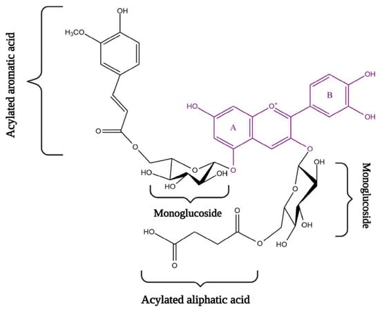 Therefore, Figure 2 shows the structural variations in anthocyanins, which occur due to differences in the type of sugar, position and number of hydroxyl or methoxyl groups in the B ring but also due to the presence or absence of acylation with both aromatic and aliphatic compounds []. The chemical structure of these polyphenols appears in the form of a C6 skeleton, and is pH dependent [,,].