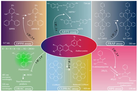 With these in mind, the most common methods for determining antioxidant capacity, which are able to assess this anthocyanin property, will be mentioned. There are two categories of such methods, one based on hydrogen atom transfer (HAT) and the second based on single electron transfer (SET). The methods based on the HAT mechanism include oxygen radical absorbance capacity (ORAC), while the types of assays that are SET based include: ferric ion reducing antioxidant power assay (FRAP), 2,2-Diphenyl-1-picrylhydrazyl radical scavenging assay (DPPH•) and cupric ions (Cu2+) reducing antioxidant power assay (CUPRAC). Likewise, specialist studies have reported that the method 2,2-Azinobis 3-ethylbenzthiazoline-6-sulfonic acid radical scavenging assay (ABTS•+) uses both mechanisms. At the same time, there are other types of tests that are not based on the aforementioned mechanisms that measure the sample scavenging ability for oxidants, which interact and produce a negative effect on major macromolecules in biological systems. One such test is hydrogen peroxide (H2O2) scavenging assay [].