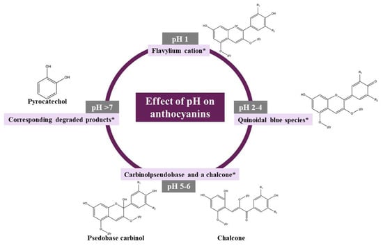 Anthocyanins at different pH values, * predominant chemical form [].