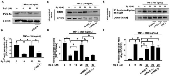 Rg3 promotes PGC-1α expression through modulation of SIRT1. Representative Western blot images (A) and relative densitometric bar graphs of PGC-1α (B) in chondrocytes stimulated to 100 ng/mL TNF-a for 24 h were shown. In some cases, cells were transfected with siRNAs 48 h before treatment with Rg3. Mitochondria SIRT3 expression levels were investigated by Western blotting assay (C,D). Representative Western blot images (E) and quantification of expression (F) of acetylated cyclophin D (CypD) and COXIV in the mitochondrial fraction. (* indicating p < 0.05 compared with the control group; # indicating p < 0.05 compared to TNF-α-stimulated cells; & indicating p < 0.05 compared to TNF-α plus Rg3 cells).