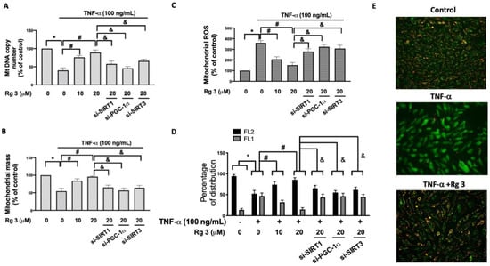 Rg3 up-regulates mitochondrial biogenesis, reduces ROS, and maintains mitochondrial function under TNF-α stimulation. The mitochondrial DNA copy number (A) and mitochondrial mass (B) were examined after administration of TNF-α for 24 h. In some cases, cells were transfected with siRNAs 48 h before treatment with Rg3. Dihydroethidium (DHE) was used for the investigation of mitochondrial ROS (C). Percentage of cells expressing JC-1 aggregates (red fluorescence; FL2) and JC-1 monomers (green fluorescence; FL1) were assessed using flow cytometry (D) or a fluorescence microscope (E). (* indicating p < 0.05 compared with the control group; # indicating p < 0.05 compared to TNF-α-stimulated cells; & indicating p < 0.05 compared to TNF-α plus Rg3 cells).