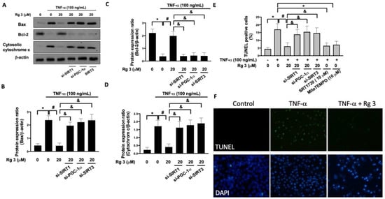 Rg3 protects against TNF-α-caused apoptosis in human chondrocytes through SIRT1/PGC-1/SIRT3 pathway. Representative Western blot images (A) and relative densitometric bar graphs of Bax (B), Bcl-2 (C), and cytochrome c (D) in chondrocytes stimulated to 100 ng/mL TNF-α for 24 h were shown. In some cases, cells were transfected with siRNAs 48 h before treatment with Rg3. TUNEL assay was used for the investigation of apoptotic cells using flow cytometry (E) and the fluorescent microscope (F). The selective activator SIRT1, SRT1720, and the inhibitor of mitochondrial ROS, mitoTEMPO, were pre-treated 2 h before TNF-α-stimulation. (* indicating p < 0.05 compared with the control group; # indicating p < 0.05 compared to TNF-α-stimulated cells; & indicating p < 0.05 compared to TNF-α plus Rg3 cells).