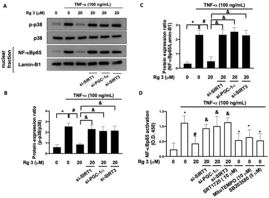 Rg3 mitigates TNF-α-caused NF-kB activation. Representative Western blot images (A) and relative densitometric bar graphs of p-p38/p38 (B) and NF-kBp65/Lamin-1 (C) in chondrocytes stimulated to 100 ng/mL TNF-a for 24 h were shown. In some cases, cells were transfected with siRNAs 48 h before treatment with Rg3. NF-kB activation was also confirmed by the NF-αB activity kit (D). In some cases, cells were transfected with siRNAs 48 hrs before treatment with Rg3. The selective activator SIRT1, SRT1720, and the inhibitor of mitochondrial ROS, mitoTEMPO, and the inhibitor of MAPK p38, S203580, were pre-treated 2 h before TNF-α stimulation. (* indicating p < 0.05 compared with the control group; # indicating p < 0.05 compared to TNF-α-stimulated cells; & indicating p < 0.05 compared to TNF-α plus Rg3 cells).