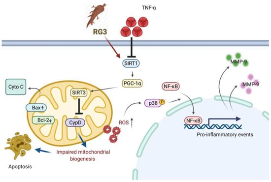 Proposed mechanisms of Rg3 in TNF-α-caused chondrocytes dysfunction. Rg3 activates SIRT1/PGC-1α/SIRT3 pathway, thereby inhibiting the TNF-α-elicited acetylation of CypD. Rg3 improves mitochondrial biogenesis, downregulates ROS, and apoptosis. Rg3 diminished the oxidative stress-associated p38 MAPK/NFκBp65 axis through upregulation of SIRT1/PGC-1α/SIRT3 signaling, leading to amelioration of IL-8 and MMP-9 secretion in chondrocytes with TNF-α stimulation.