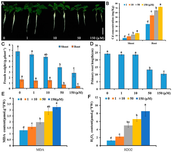 Growth and physiological responses of Cucumis sativus L. to Cd stress. Ten-day-old seedlings were treated with 0, 1, 10, 50, or 150 μM CdSO4 for 10 d (A–D) or 48 h (E,F) and growth and physiological indices were assessed: (A) morphology; (B) Cd content; (C) fresh weight; (D) primary root elongation; (E) MDA content; (F) H2O2 content. Vertical bars represent standard deviation of the mean of three replicates (n = 10–20 seedlings). Significance of differences between the treatments was statistically evaluated by analysis of variance (ANOVA). Different letters on the bars indicate significant difference (p < 0.05) between the treatments.