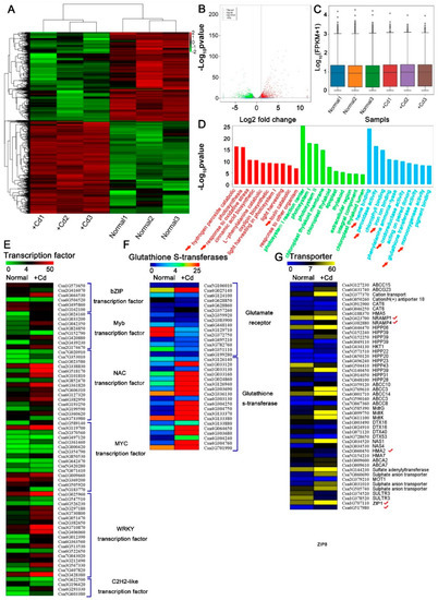 Analysis of Cd-exposed cucumber transcriptome. (A) Heatmap representation of a one-dimensional hierarchical clustering of differential gene expression as determined by mRNA-seq for Cd-exposed cucumber relative to normal plant (Cd-free). (B) Differential transcript abundance of Cd-free and Cd-treated seedlings. The x-axis represents the log2 fold change under the mean normalized expression of all transcripts (y-axis). Green (downregulation) and red (upregulation) dots indicate differential genes (p < 0.01). (C) Box–whisker plot FPKM (fragments per kilobase of exon per million fragments mapped) of six samples (Normal1, Normal2, Normal3, +Cd1, +Cd2 and +Cd3). (D) GO enrichment analysis of Cd-exposed and normal cucumber transcripts in seedlings. (E–G) Hierarchical clustering of differentially expressed mRNAs that were significantly different in transcript abundance between Cd-free and Cd-exposed cucumbers. Heat map represented the gene expression level of Cd-respond mRNAs (p < 0.05). √ mean candidate cadmium transporter. Ten-day-old cucumber seedlings were exposed to 0 (Normal) or 50 μM Cd (+Cd) for 4d, and the whole plant was selected for RNA extraction. Significance of differences between the treatments was statistically evaluated (p < 0.05).