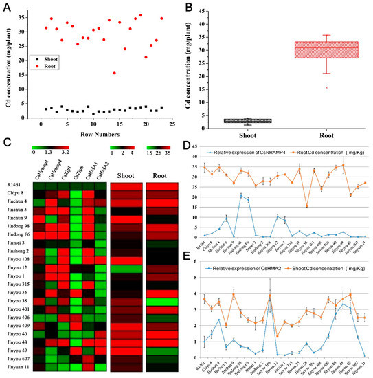 Correlation analysis of ionomics and gene expression profiles identified the major Cd accumulation genes in cucumber. (A) Distribution of Cd accumulation in the roots and shoots of 23 cultivated cucumber. The red circle represents shoots, and the black box represents roots. (B) Box–whisker plot Cd concentration of all 23 cultivated varieties identified by ICP-MS. (C) Hierarchical clustering of six Cd-related transporters expression and Cd accumulation in the shoots and roots of 23 cultivated varieties. Heat map represents the gene transcript level and Cd accumulation. (D,E) Association analysis of the expression of CsNramp4 (D) and CsHMA2 (E) in 23 cultivated varieties along with Cd content in the roots and shoots. Ten-day-old cucumber plants were grown in nutrient solution supplemented with 0 and 0.5 μM Cd for 10 days.